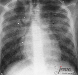 Abbildung: Beispiel alveoläres Lungenödem. Über beide Lungen diffus verteilte, unscharf begrenzte Herde mit Tendenz zur Konfluation und Ausbildung eines Bronchopneumogramms.